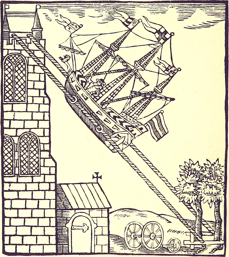 Before the dirigible was the air ship of 1608, reproduced in History of the Parish Church of Saint Michael and All Angels, Chipping Lambourn by John Footman, 1894.