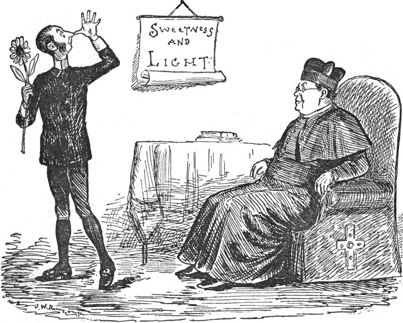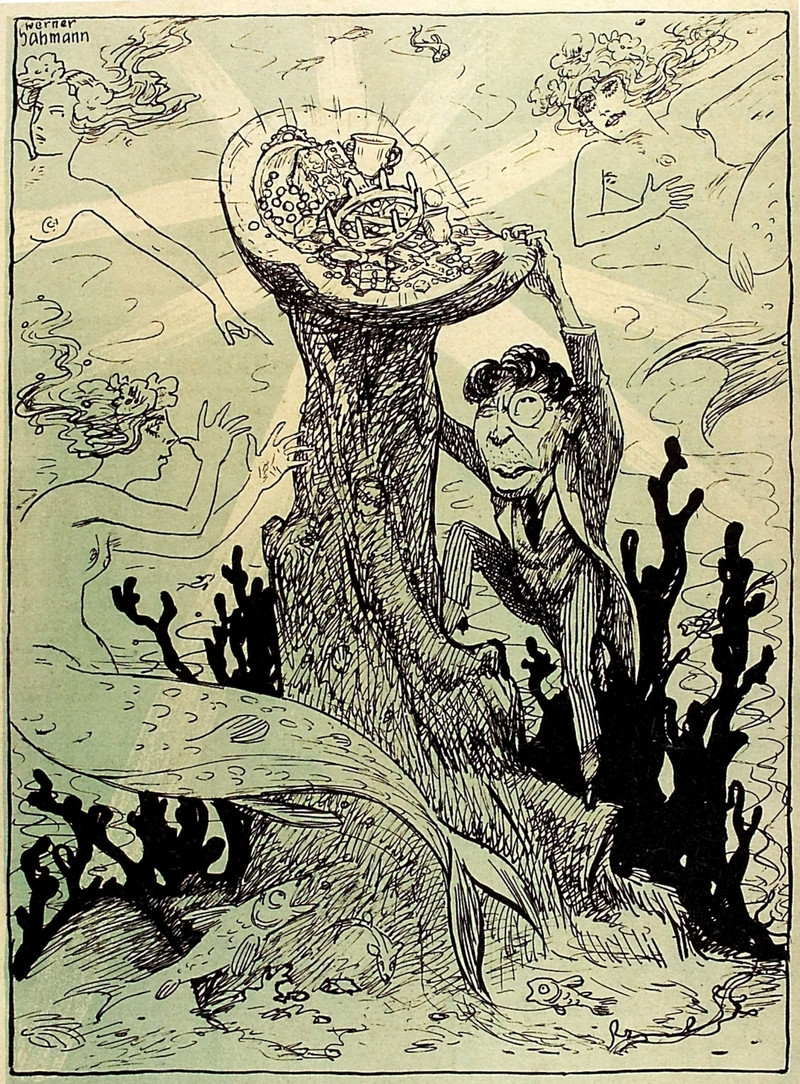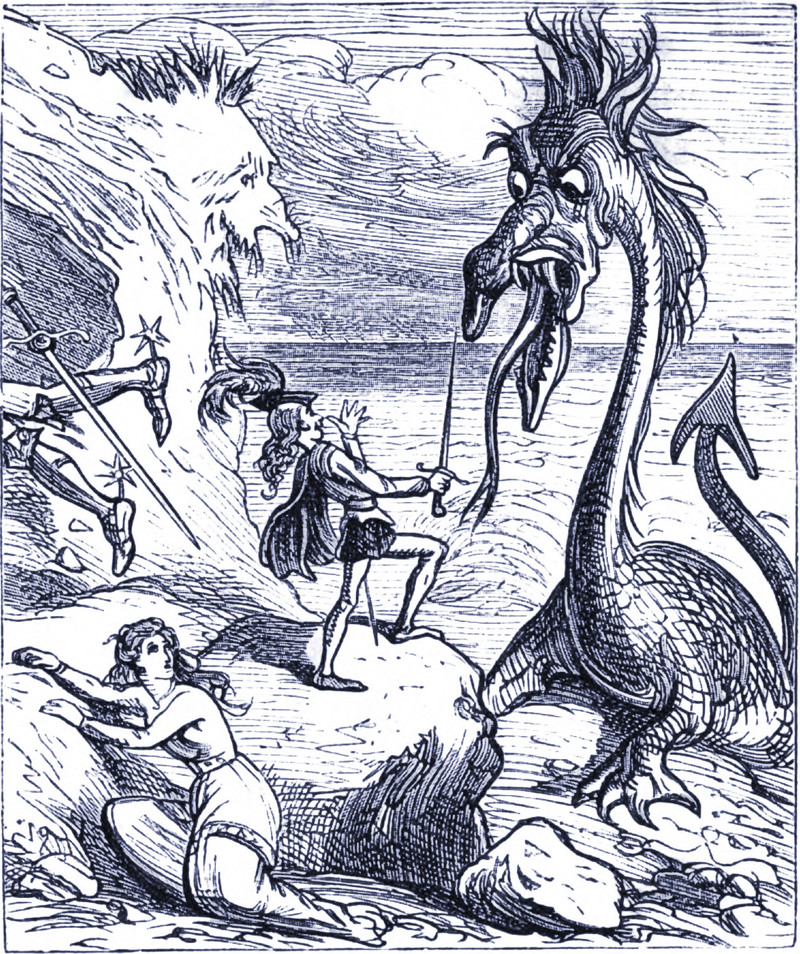Sir Marmalade the Mouldy thumbs his nose at a sea monster. From Judy, Or The London Serio-Comic Journal, 1882.