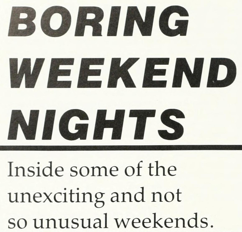 "Boring Weekend Nights. Inside some of the unexciting and not so unusual weekends." A headline from the College of William and Mary's yearbook of 1984.