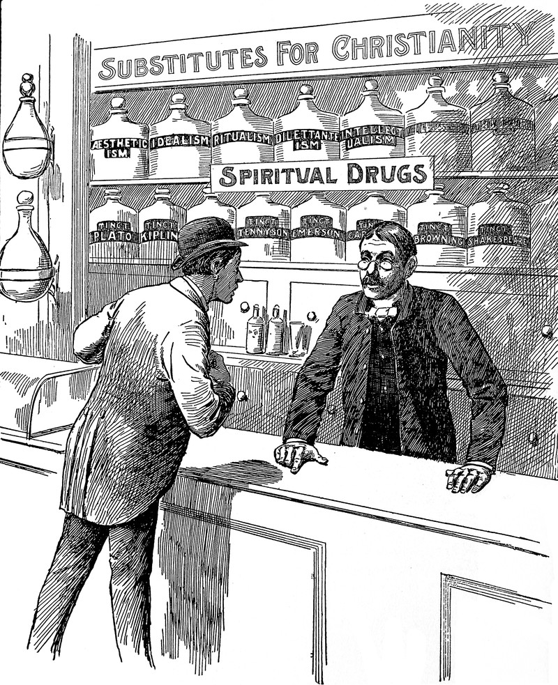 Substitutes for Christianity here include the spiritual drugs of aestheticism, idealism, ritualism, dilettantism, and intellectualism, as well as tinctures of Plato, Kipling, Tennyson, Emerson, Carlyle, Browning, and Shakespeare. From Blasts from The Ram's Horn, 1902.