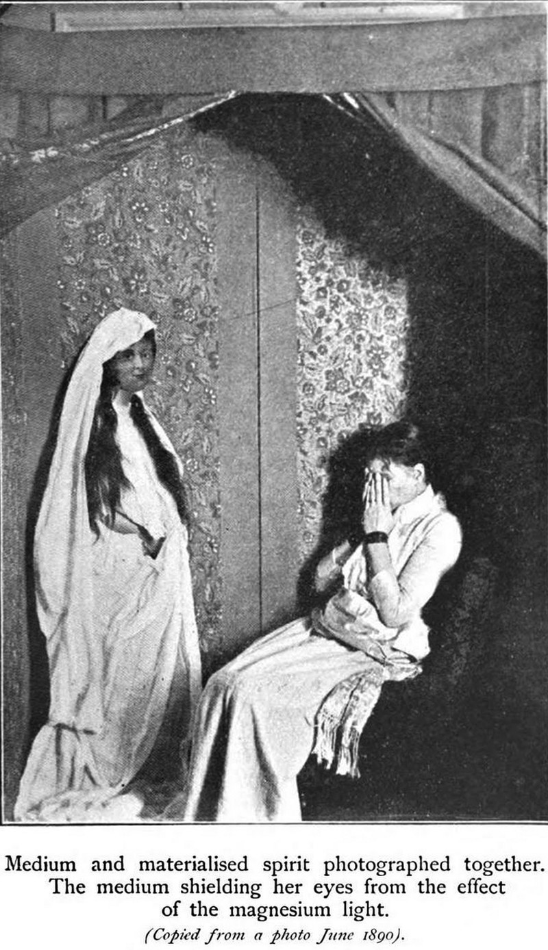 "Medium and materialised spirit photographed together.  The medium is shielding her eyes from the effect of the magnesium light."  From Shadow Land or Light from the Other Side by E. d' Espérance. 1897.