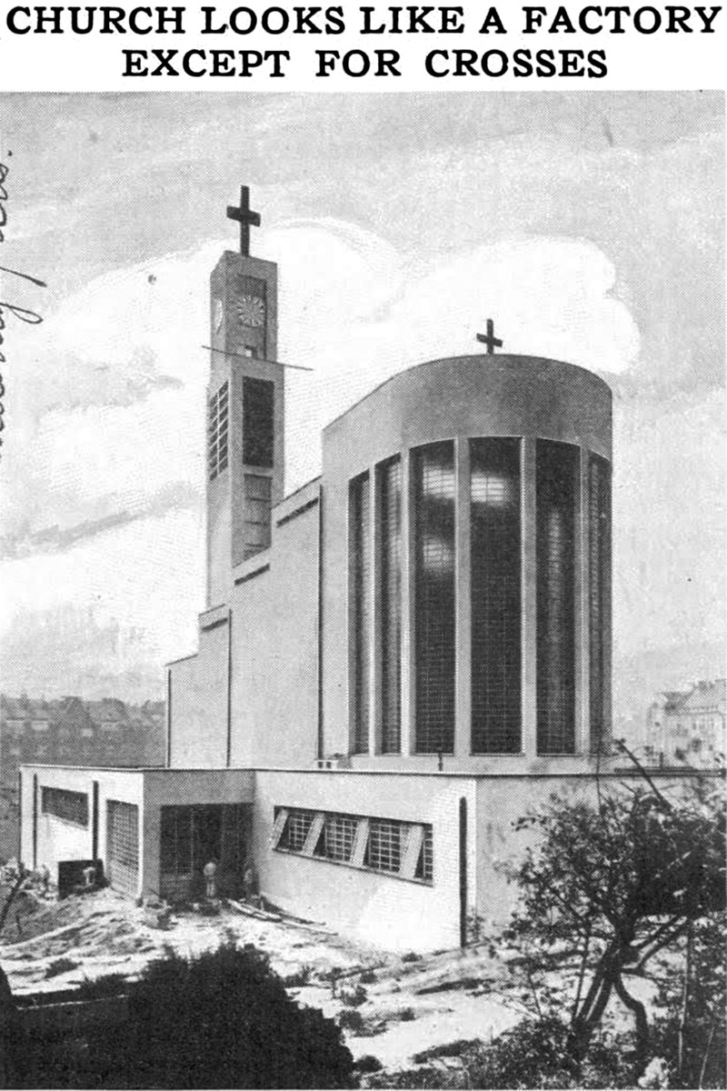 "Church looks like a factory except for crosses."  From Popular Mechanics, 1931.
