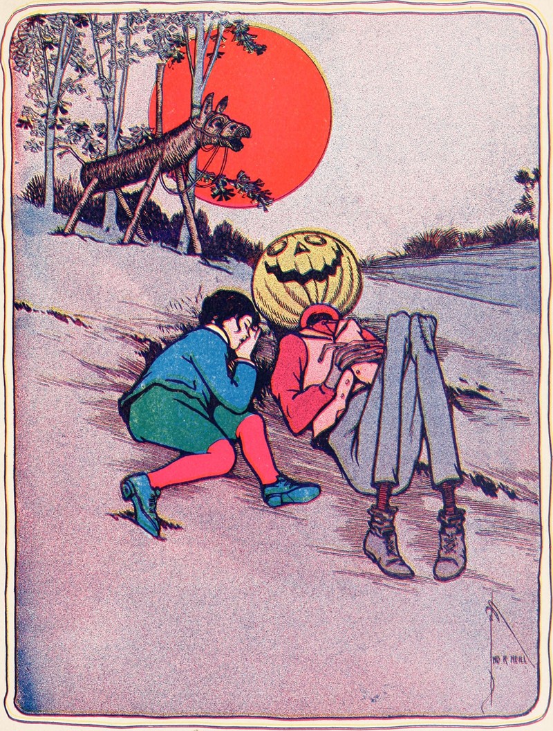 From St. Nicholas magzine, 1910. The caption reads, "A strange-looking, cloaked figure, with a lighted jack-o'-lantern for a head, ushered them into the drawing-room."