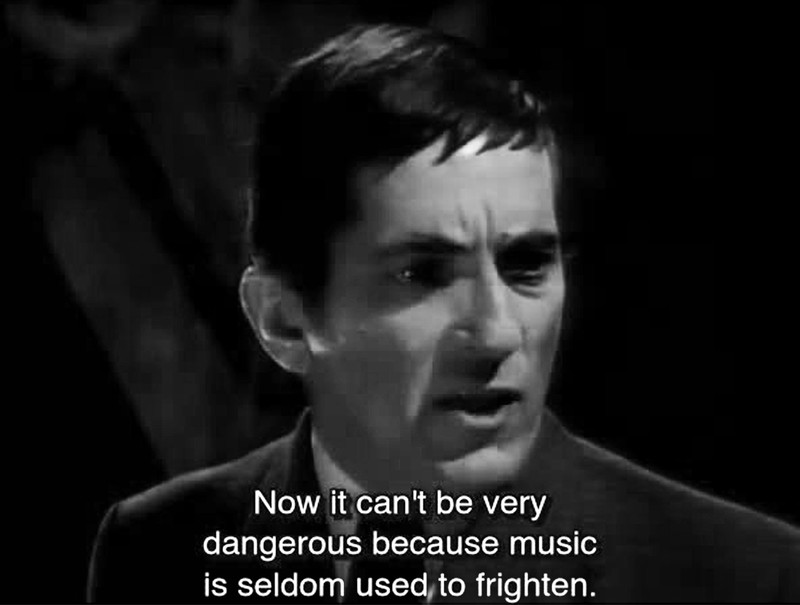 A rather dubious statement: "Music is seldom used to frighten." From Dark Shadows episode 1063.