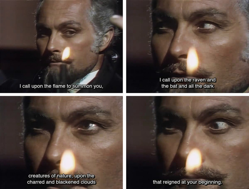 A black magick incantation from Dark Shadows episode 762. "I call upon the flame to summon you. I call upon the raven and the bat and all the dark creatures of nature, upon the charred and blackened clouds that reigned at your beginning."