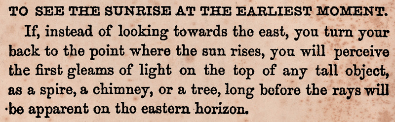 Here's how to see the sunrise at the earliest moment, by actually turning your back on the east. The text reads: “To see the sunrise at the earliest moment. If, instead of looking towards the east, you turn your back to the point where the sun rises, you will perceive the first gleams of light on the top of any tall object, as a spire, a chimney, or a tree, long before the rays will be apparent on the eastern horizon.” From The Magician's Own Book, 1871.
