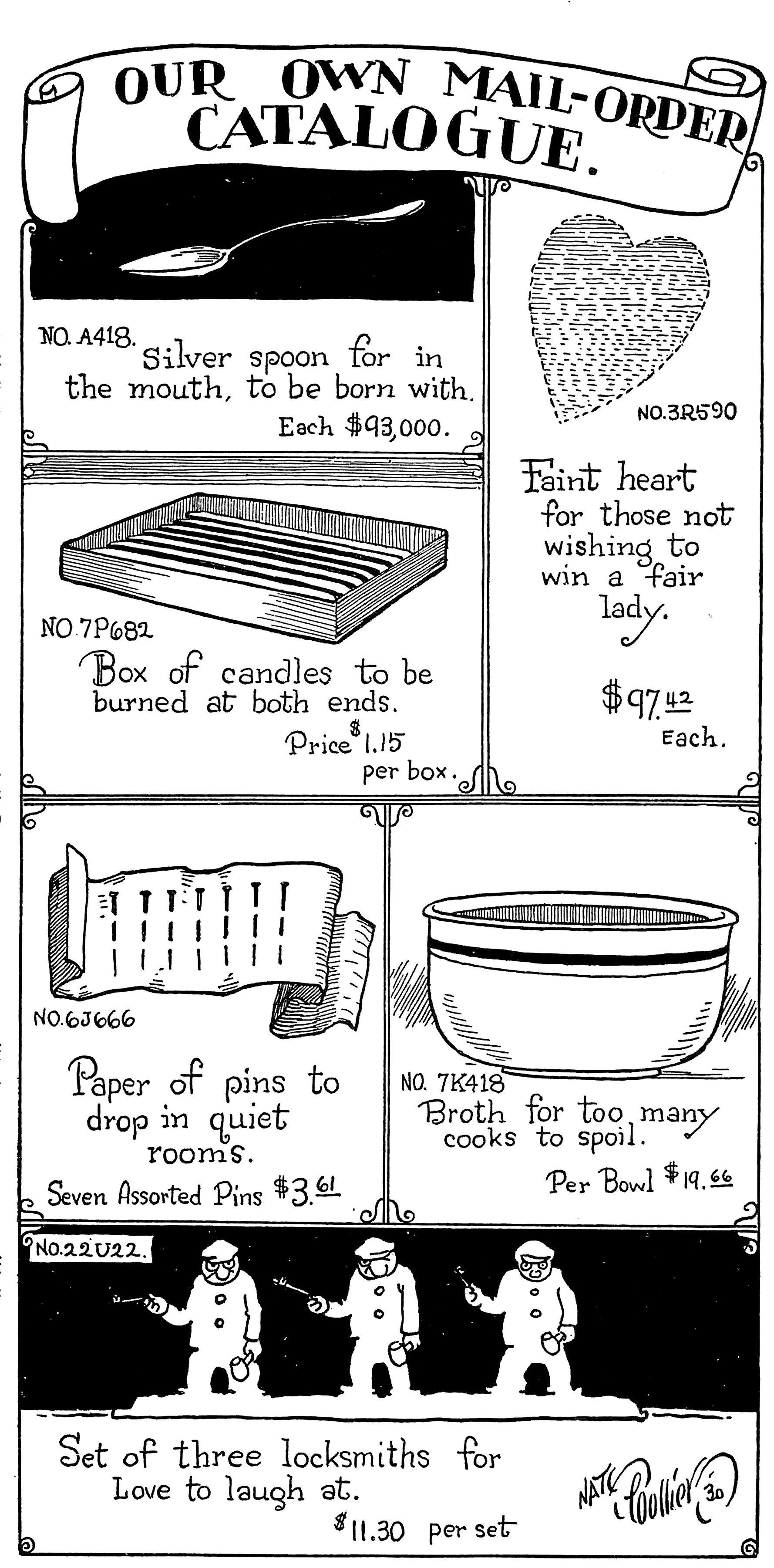 Adjusted for inflation, the silver spoon is $1,800,000, the faint heart is $1,880, the two-ended candles are $20, the pins to drop are $70, the broth for too many cooks is $380, and the three locksmiths are $220. From Life, 1930.