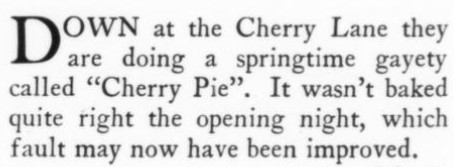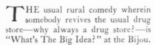 ***There is...that terrible moment at which one of the deck-hands hears the word "efficiency" and most comically asks, "What fish did you see?"***[Hello, Lola!] does not even live up to the standard of things called Hello, Lola!***Easter, a play twenty-five years old, looks and acts its age.***That portion of the public which likes to take its drama while lolling on the small of its intellect.***Add to them the delightful young giggler of one Phyllis Connard.***[Beau-Strings] is a cleverly dull evening.***["Playing along," in the Wilde]Dudley Digges, who directed [a 1926 revival of The Importance of Being Earnest] plays along capitally as the country curate.***...and twenty more Et Ceteras dutifully doing forty So Forths.***If so many Jims Corbett and Felixes Isman had not had their memories printed...***Notes on a few of the attachments:"Great Caesar's Ghost": Previously, I've encountered this only as an oath, never as an actual persona or archetype! (May be a one-off.)The "pin drop / Grant's tomb" item illustrates exactly that--a protagonist in a humor piece dropping the proverbial pin in the proverbially silent tomb.The incidental truncation that appears to read "cow Art" in the item labeled "yes" actually said "Moscow Art [Theater, I guess]"; but the layout had to make a detour around an illustration, as one does.