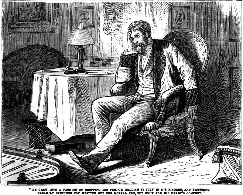 An illustration from an 1879 issue of Frank Leslie's Popular Monthly magazine. The caption reads: "He grew into a fashion of dropping his pen, or holding it idly in his fingers, and picturing dreamily sketches not written out for mortal ken, but only for his heart's comfort."