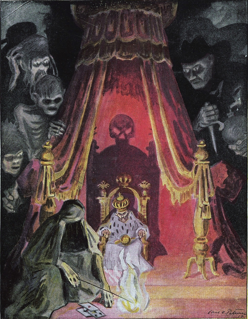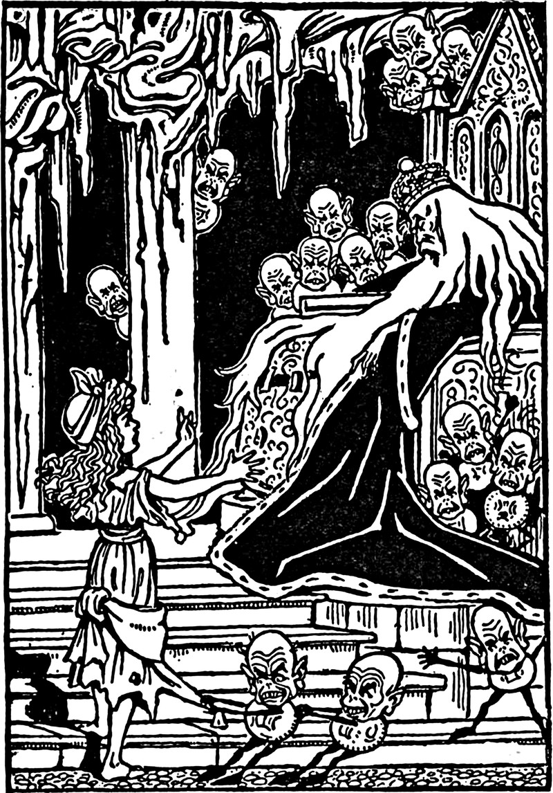 "The king poured liquid into the holes in their heads." From American Fairy Tales by Garrett Brown and illustrated by John Edward O'Keeffe, 1911.