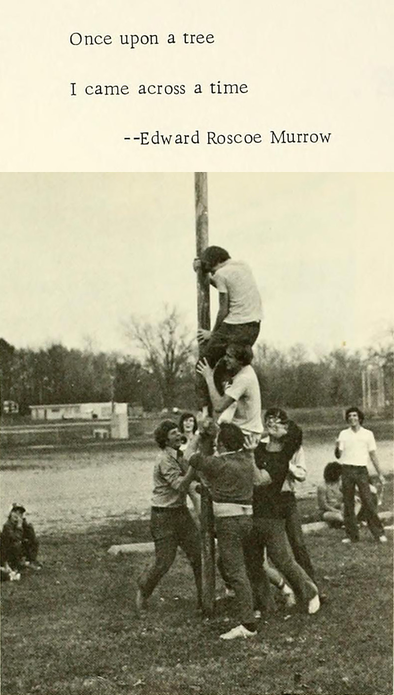 "Once upon a tree, I came across a time" (Theodore Roethke, misattributed here to Edward R. Murrow).  From Manchester College's 1976 yearbook.