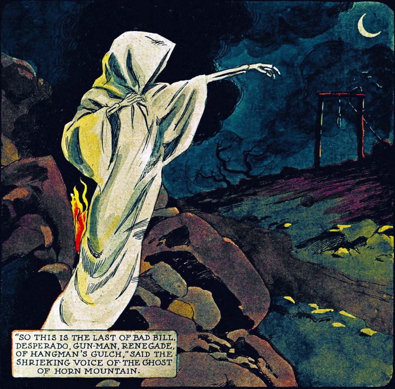 "'So this is the last of Bad Bill, desperado, gun-man, renegade, of Hangman's Gulch,' said the shrieking voice of the ghost of Horn Mountain." From American Indian Weekly, 1911.