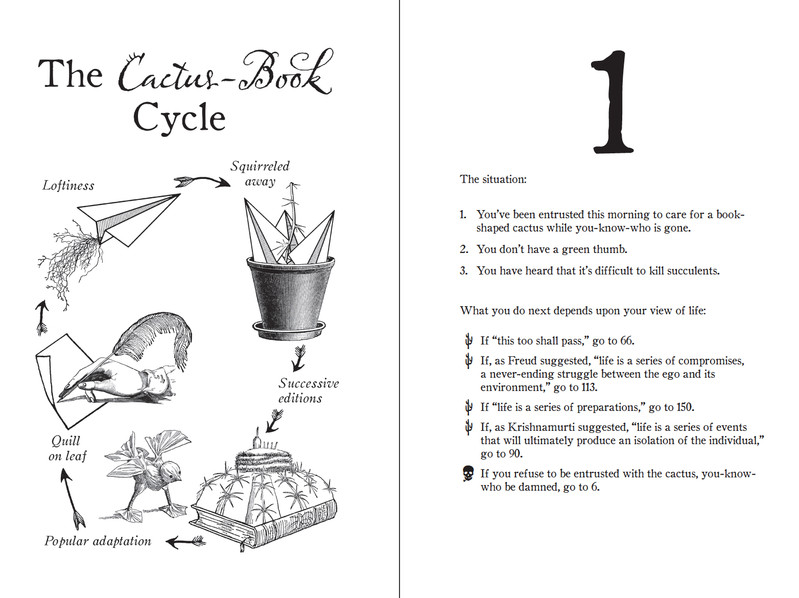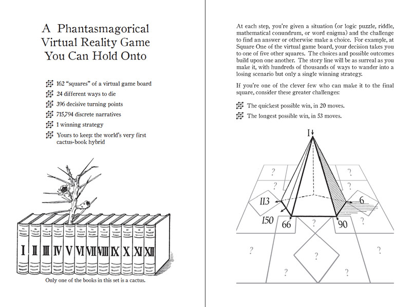 This Book is a Cactus turned out to be the most difficult project we've ever tackled. We wanted to recreate the very first computer game we programmed, from back in the 1980s—the Tamagotchi precursor of a virtual flower—but this time in book form. What we ended up with is a combination choose-your-own-adventure and puzzle book; it's a surrealistic virtual reality experience you hold in your hands, as the book is also a cactus that you attempt to keep alive. A hybrid cactus-book. Each page is like a square on a game board. You make decisions and solve riddles, and your choices/answers lead to different squares. Math puzzles, word puzzles, logic puzzles, and riddles appear at intervals within the fractal storyline.