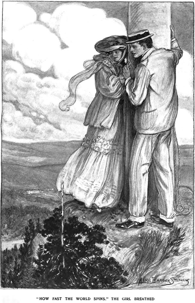 An illustration from a 1904 issue of Harper's magazine.  The caption reads: "'How fast the world spins,' the girl breathed."