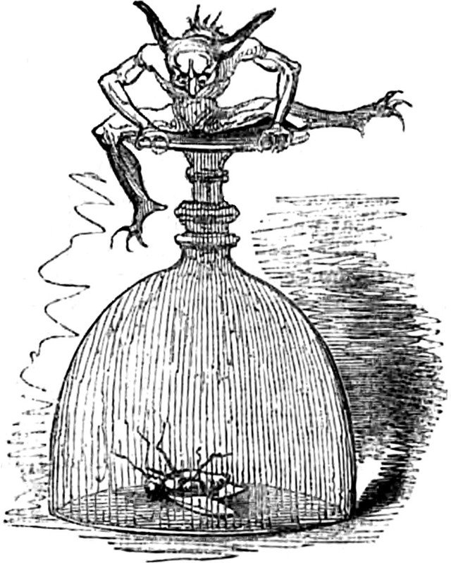 An illustration from a 1919 issue of Munsey's magazine. The caption reads: "He saw a veritable cloud of evil creatures, swimming about like fish in dark waters."