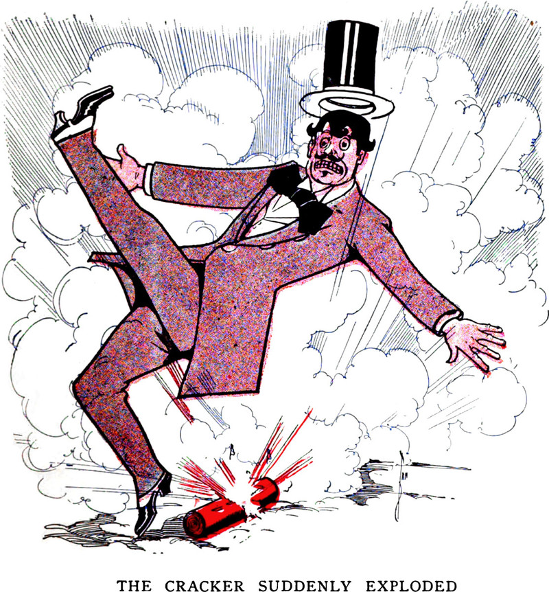 An illustration from John Dough and the Cherub by L. Frank Baum (1906).  The caption reads: "The cracker suddenly exploded."
