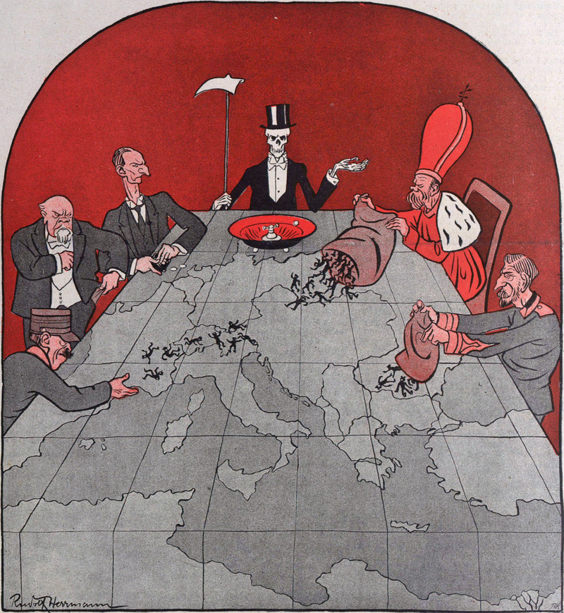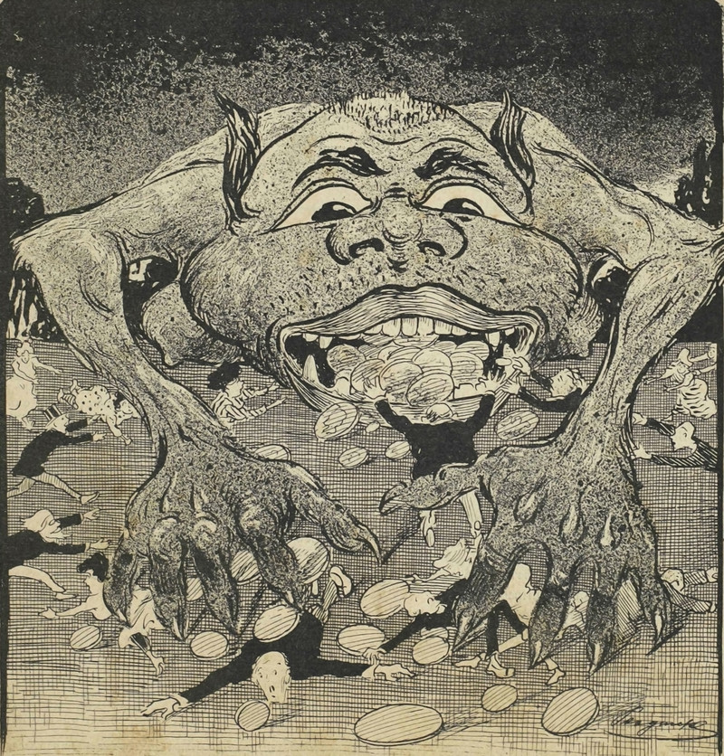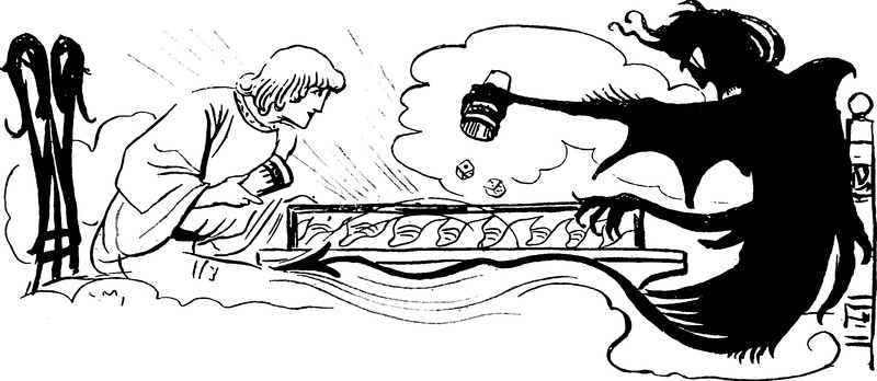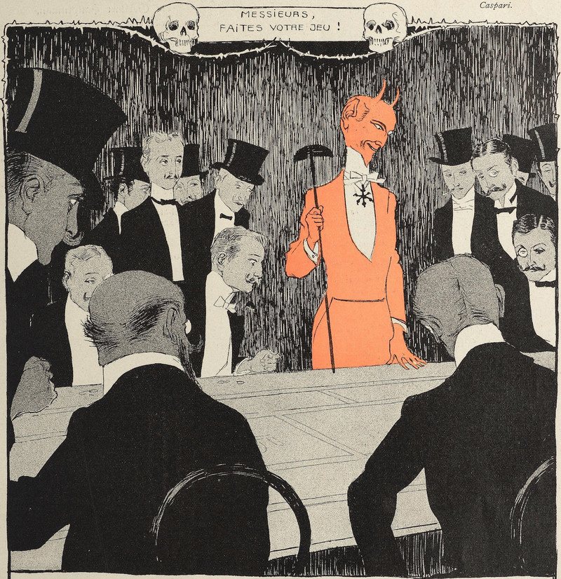 A duck-headed butler opening the door for a Poe-esque gentleman? Check. (By the way, that's a precursor to David Lynch's commercial for the Sony Playstation, in which a duck says, "Welcome to the 'third place.'") A faceless figure surrounded by disembodied cackling faces? Check. A crow in a jacket standing on a meditative sheep while an anthropomorphic dice cup spills and kills an innocent bystander? Check. A skeleton holding the Ace of Hearts? Check. Edward Gorey-esque despair on a settee? Check. Granted, the figure blowing his head off does seem rather too much. From Judy, Or The London Serio-Comic Journal, 1884.
