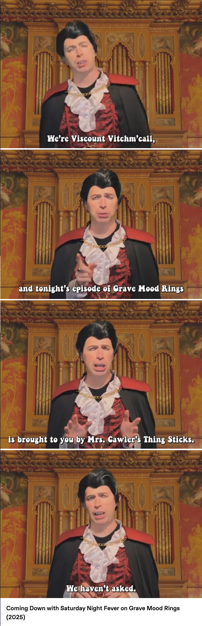 Parody analog horror meets 1970s tropes (like pet rocks, lava lamps, disco music, bell-bottom pants, mirror balls, and of course mood rings) in the web series Grave Mood Rings. It pokes fast fun at classic slow-moving Gothic soap operas like Dark Shadows and the Canadian series Strange Paradise. In addition to a vampiric Viscount, a castle is home to a groovy Doctor (a phlebotomist, naturally), a jolly housekeeper with her own laugh track, a werewolf Vicar, and an arch-nemesis riddler wearing a Sphinx mask. Corny wordplay, the occasional bizarre sing-a-long, and haunted doughnuts punctuate the proceedings, in the tradition of the sketch comedy of MadTV, Kids in the Hall, and SCTV.