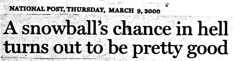"A snowball's chance in hell turns out to be pretty good." From The National Post, 2000. Speaking of which, see A Snowball's Chance in Hell.