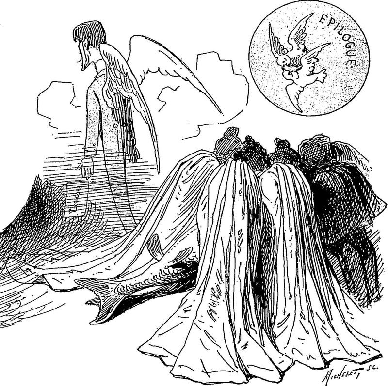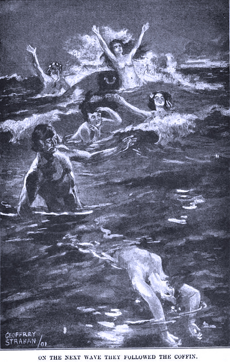 Merfolk follow a surfing coffin. From Irish Fairy Tales, Folklore and Legends, 1904.