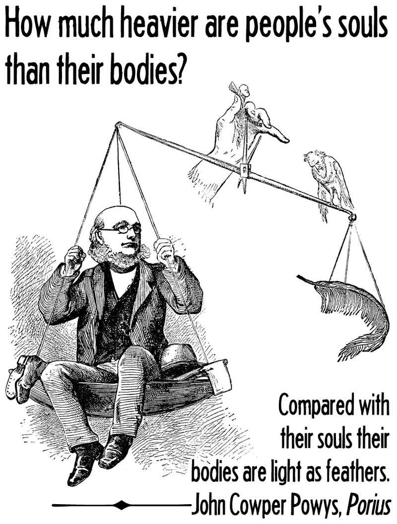 The text reads: "How much heavier are people's souls than their bodies.  Compared with their souls their bodies are light as feathers." —John Cowper Powys, Porius