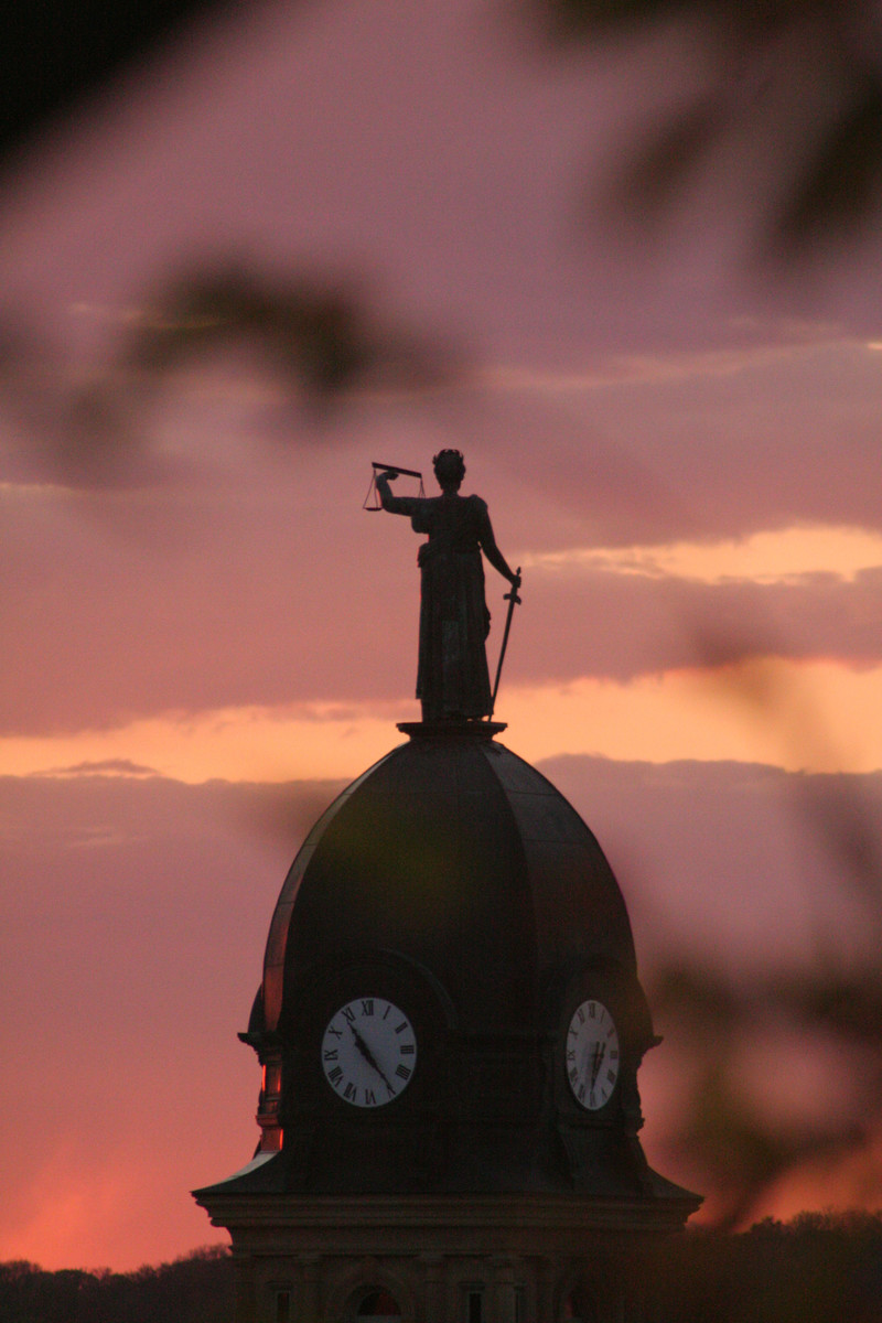 Temporal anomaly investigator Jordan Green shares a Before & After of an anomalous clock tower whose statue lost a sword. "On April 3, 2013 the statute on top of the Blue Earth County Courthouse [Mankato, Minnesota] turned to the north by about a 1/4 turn and dropped its sword into the courthouse lawn."