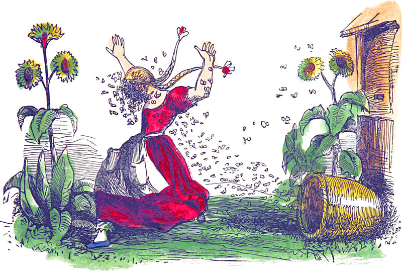 Pollen was once considered fairy gold. "Did you ever wish with it? Just touch your finger to the pollen, and then wish. After you wish, blow hard twice to get the pollen off. If it goes, your wish will come true, but if not, you will not have your wish" (E. M. J., "A March Ramble," Primary Education 1906). Our illustration of the pollen fairy appears in Blossoms by the Way by Carrie Adelaide Cooke, 1882.