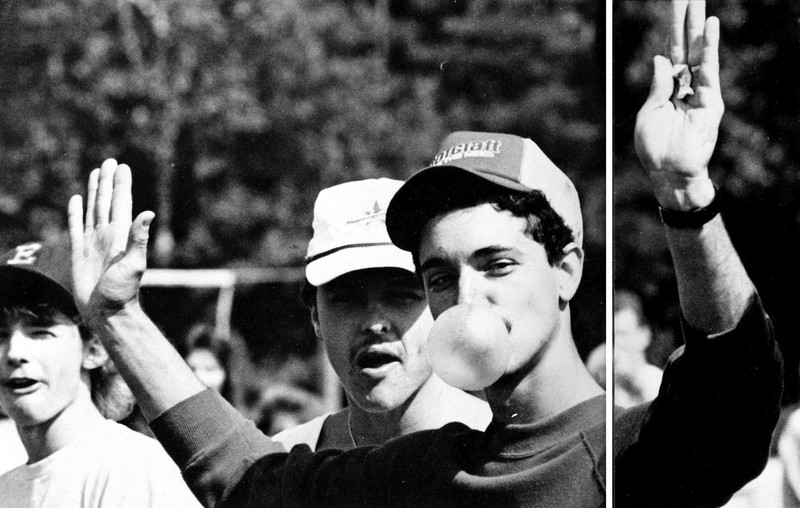 The first day of autumn is when a mustachioed friend drops leaves on you.  From Southeastern College's 1985 yearbook.