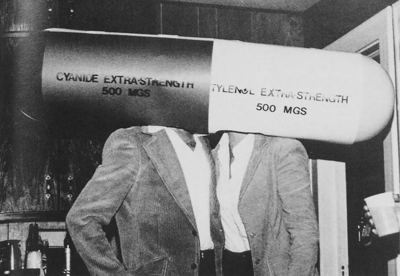 Two doctors don a poison pill costume.  (Supposed to be funny?)  From Indiana University School of Medicine's 1983 yearbook.