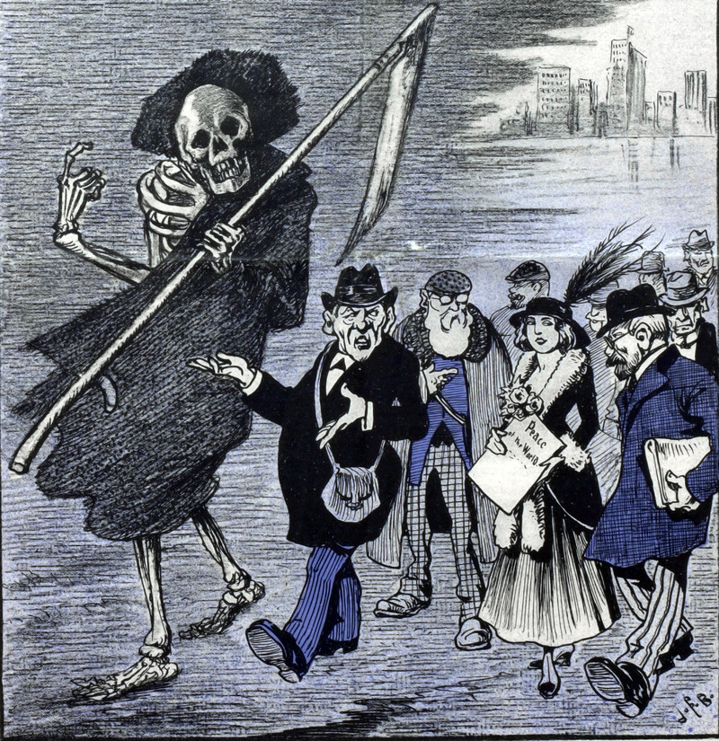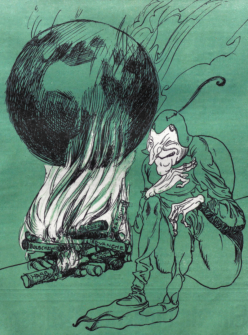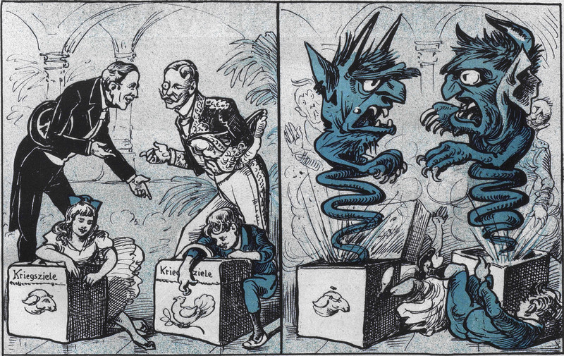 The Easter Bunny delivers the eggs of distress, disease, hunger, rising costs, war, and death. From Nebelspalter, 1916.