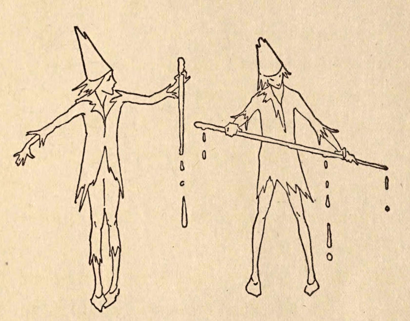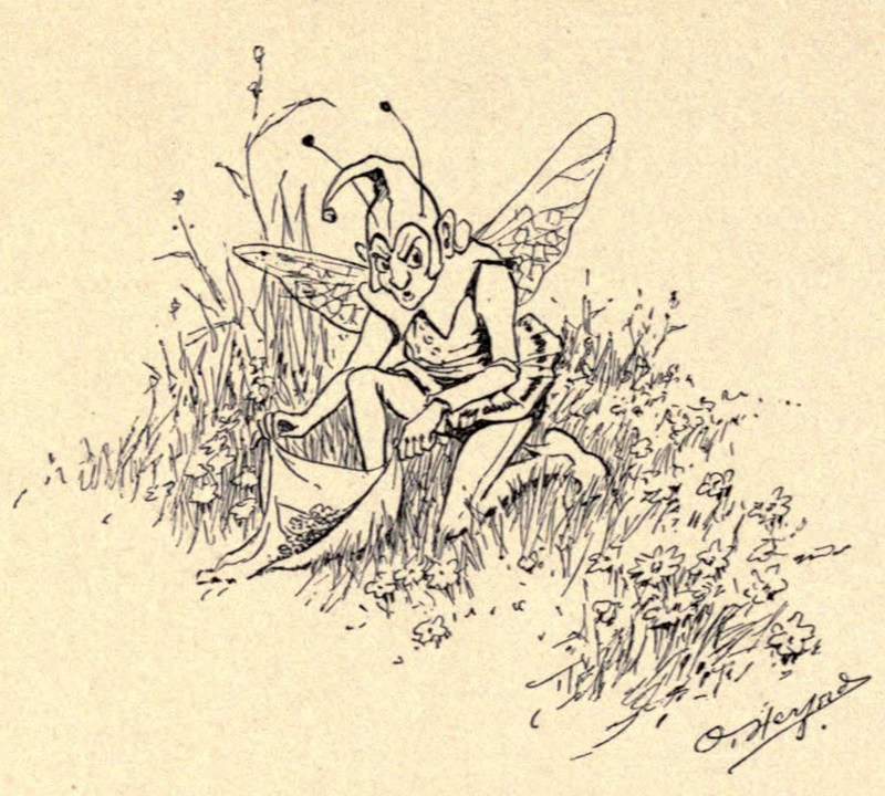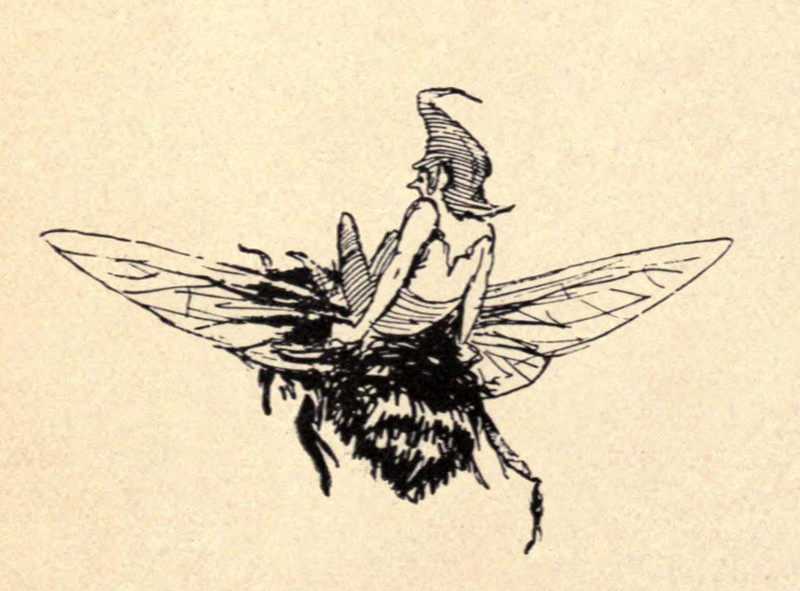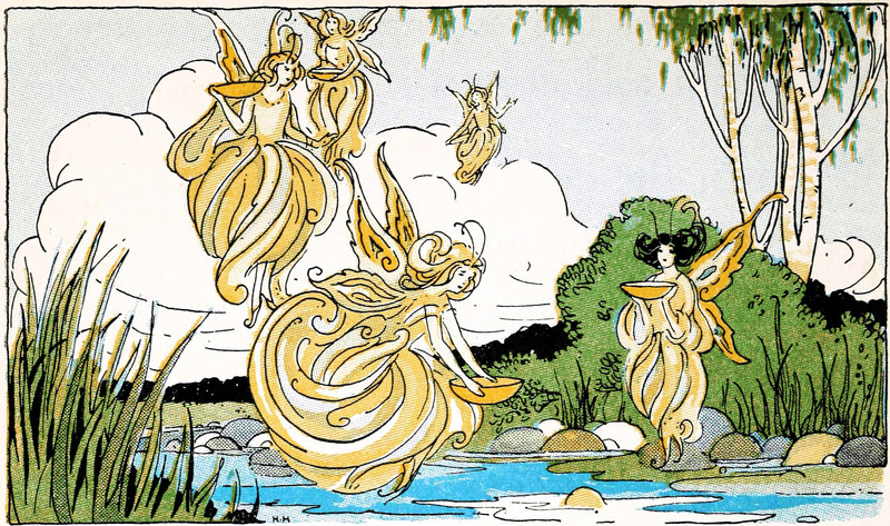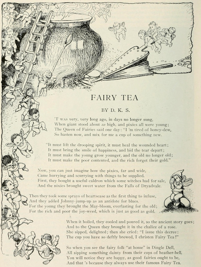 Just as you may have guessed, fairy tea contains heartsease, Johnny-jump-up, May-bloom, joy-weed, and waterfall water. Note that both "heartsease" and "Johnny-jump-up" are names for wild pansies. How to tell one from the other? We suggest that one is mostly purple and one is mostly yellow. From St. Nicholas, 1914.