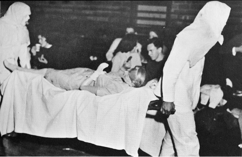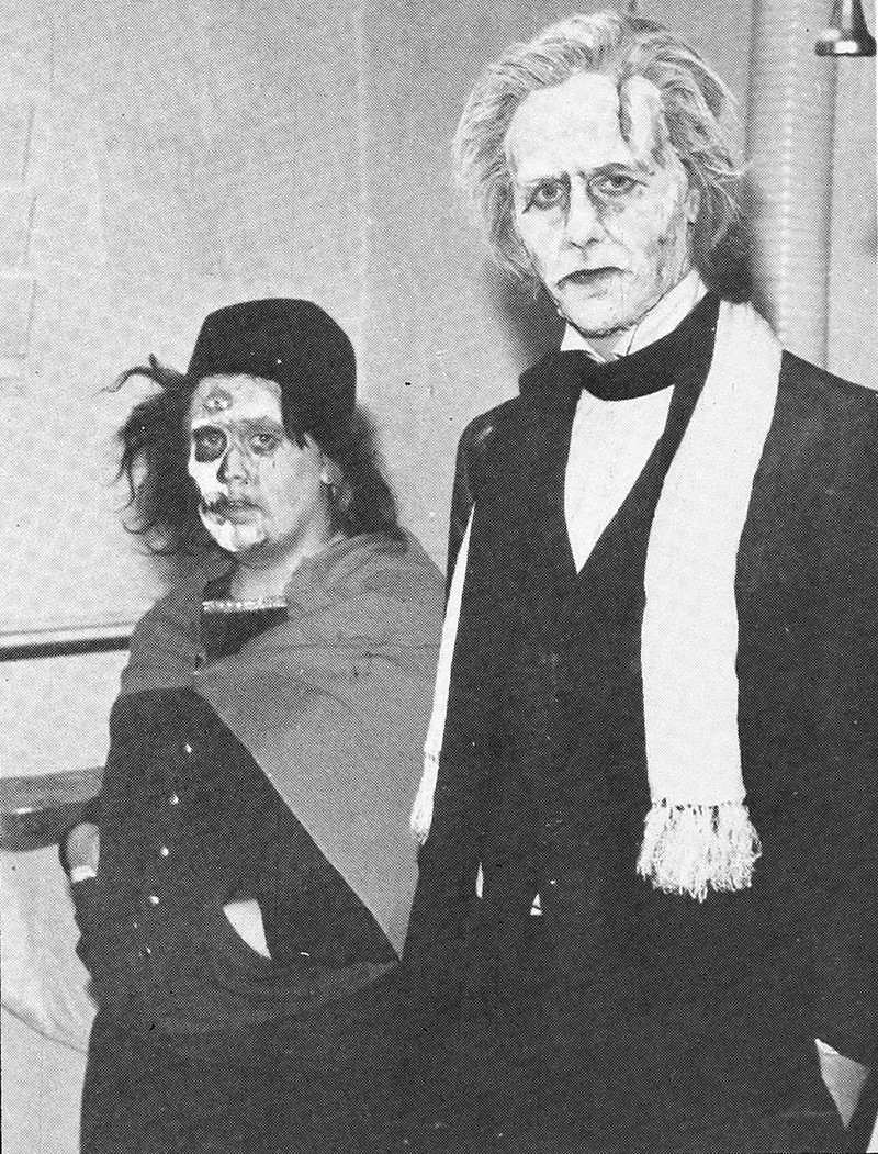 The caption to this says that the ghost medics make the refreshments (dill pickles, peanut butter sandwiches, and black coco) seem even worse. From Olivet Nazarene's 1959 yearbook. See How to Hoodoo Hack a Yearbook.