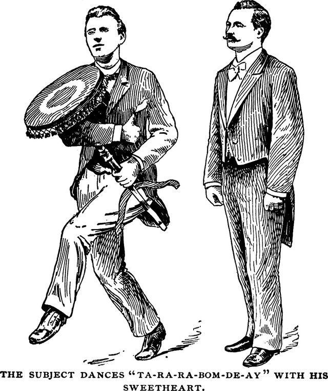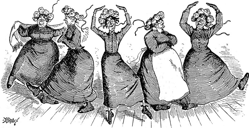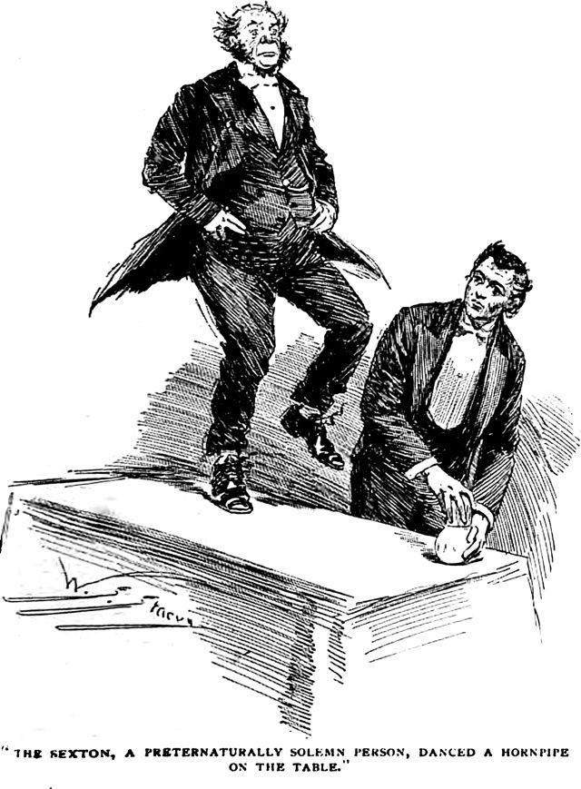An illustration from a 1902 issue of The Strand magazine. The caption reads: "The sexton, a preternaturally solemn person, danced a hornpipe on the table."