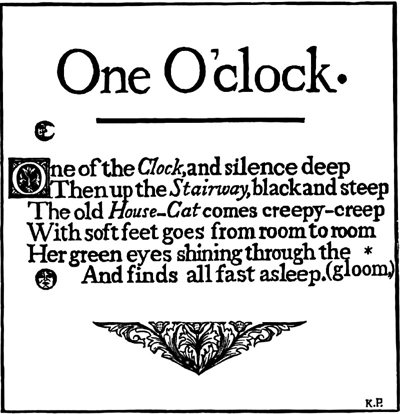 Our Favorite Asterisk of All Time?Check out the very special asterisk in this little verse from The Wonder Clock by Howard Pyle, 1887. It stands for the word gloom (in all fairness, how much clarity can we expect of gloominess?) even as it concentrates what little light there is into a gleam in a house cat's eye. Is the asterisk here a genuine example of visual poetry, or did the typesetter run out of space and improvise grandly? We don't care, as the result stands. (Note that we hunted down what would appear to be the web's only other gloomy asterisk, if only to give the cat's other eye a twinkle.)