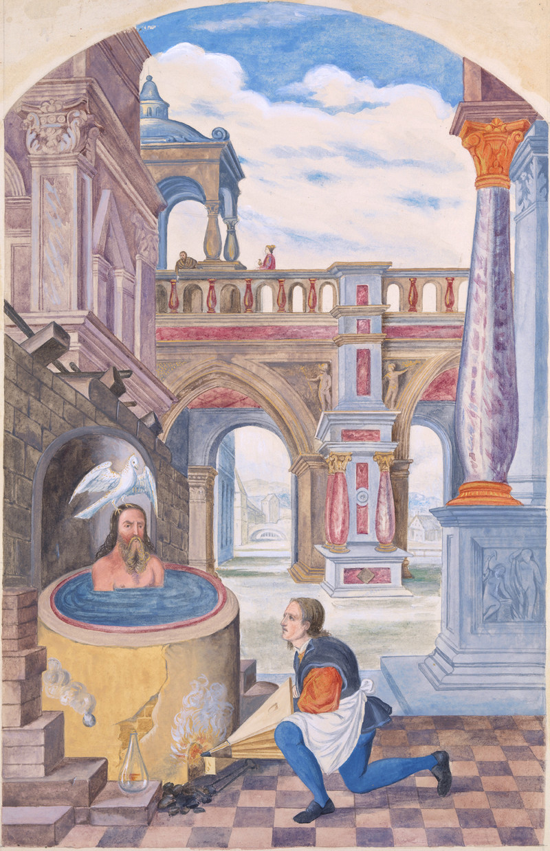 "Watercolour representing the process of self-destruction required to attain the elixir of life, after Salomon Trismosin's sixteenth-century alchemical manuscript, Splendor Solis."