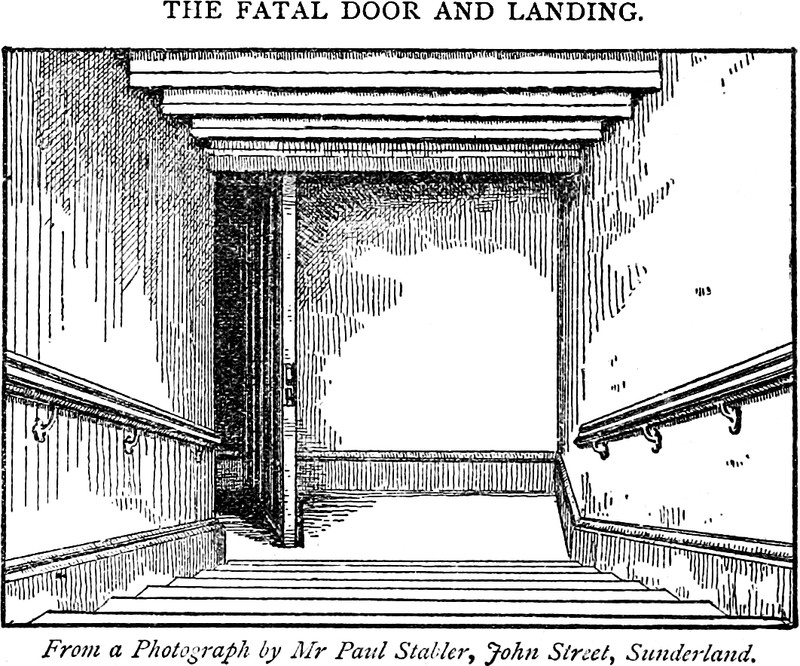 You've heard of being at "death's door."  Here's what it look like: "The fatal door and landing," from The Victoria Hall Disaster, 1883.