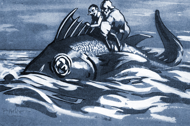 From The Children's Newspaper, 1959. Across: 4 Haddock, 5 Hake, 8 Plaice, 9 Trout. Down: 1 Mackerel, 2 Cod, 3 Skate, 5 Halibut, 6 Turbot, 7 Eel.