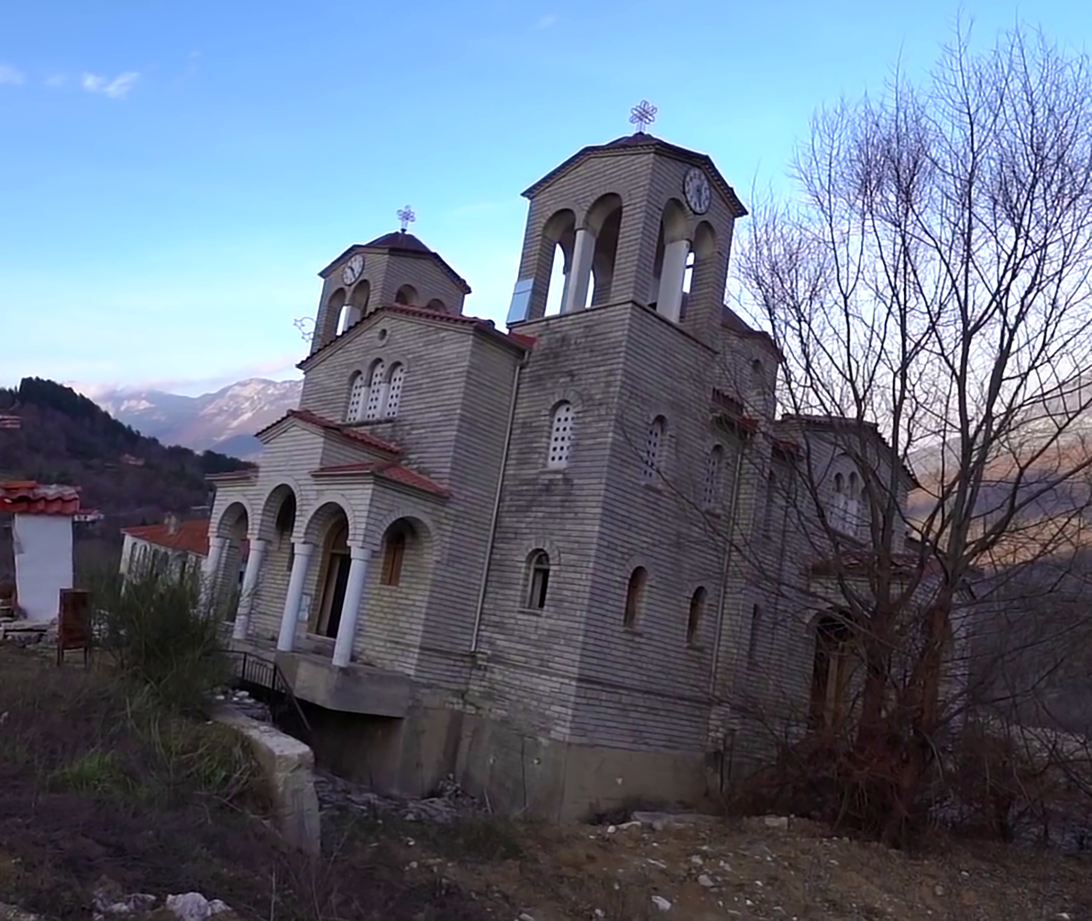 We spotted a temporal anomaly at "the crookedest church in the world." This Greek church, in the village of Ropoto, became wonky due to a landslide. There are two clock towers (bravo!) with faces that don't agree. (The guys from Exploring the Unbeaten Path venture inside the church for a mind-warping experience.) You'll likely have already diagnosed this temporal anomaly: as David Miller has said, "when space is folded, time is folded." Yet profound mysteries yet abound: how is this church intact, resting as it does at that incredible angle?