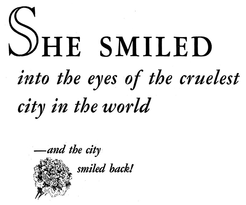 "She smiled into the eyes of the cruelest city in the world — and the city smiled back!"  From Youth's Companion, 1928.