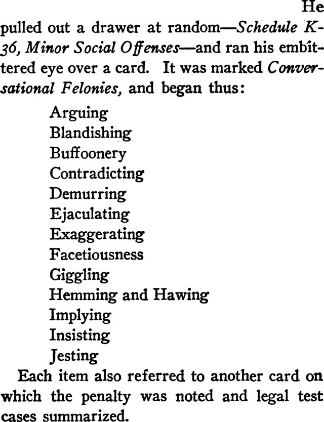 He pulled out a drawer at random—Schedule K-36, Minor Social Offenses—and ran his embittered eye over a card. It was marked Conversational Felonies, and began thus: