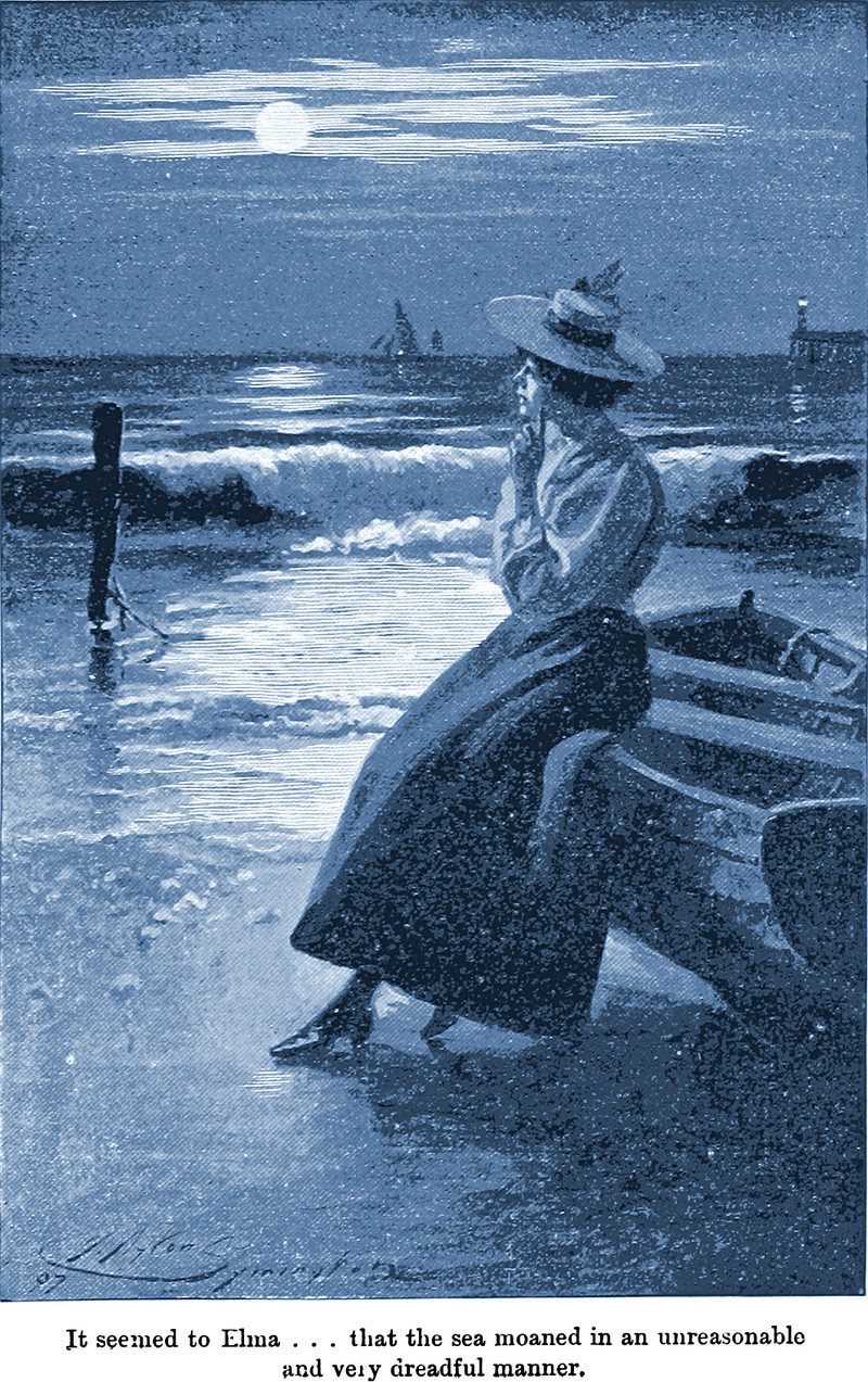 "It seemed to Elma ... that the sea moaned in an unreasonable and very dreadful manner." From Wild Kitty by Elizabeth Thomasina Meade, 1897.