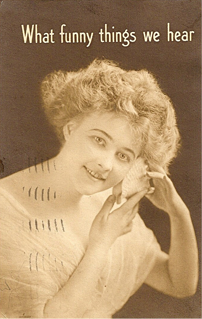 Can one hear the ocean in a seashell? Yes! The tides are at play in the inner sanctum of the shell, pulled by the gravity of the full moon. Waves of sound rush from the spiral of the shell into the cochlear spiral of the inner ear. Inexplicably, seagulls are often heard as well. Skeptics may claim that the sound one hears is the rushing of one’s blood. Yet "it has long been established that the makeup of human blood bears a haunting resemblance to that of sea water” (Larry Gedney, Alaska Science Forum). (Previously, we found vintage proof that the ocean one hears in a seashell is the shore at Atlantic City.)