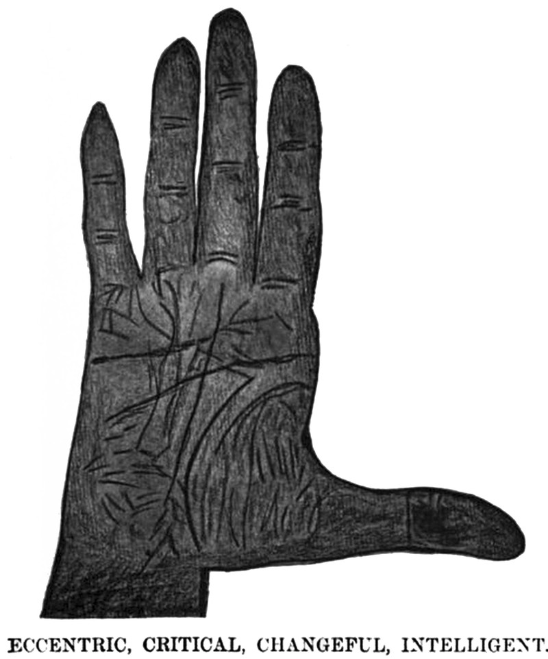 "The non-conformist scientific hand." The caption doesn't identify this as the hand of a non-conforming, scientific person but rather suggests that the hand itself is a non-conforming scientist. From New Discoveries in Palmistry by Joseph Bryant Hargett, 1901.