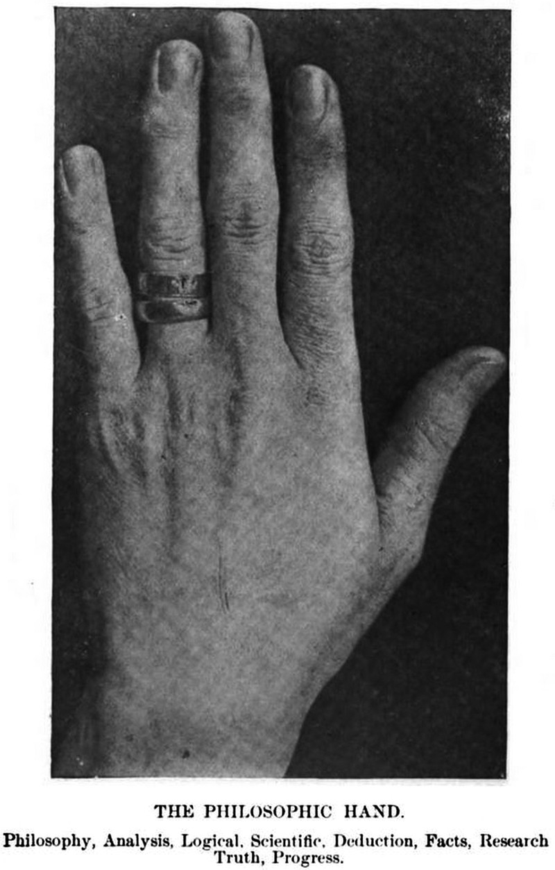 "The philosophic hand -- philosophy, analysis, logical, scientific, deduction, facts, research, truth, progress." The caption doesn't say this is the hand of a philosophic person but rather that it embodies philosophy, analysis, logic, scientism, deduction, facticity, research, truth, and progress. Therefore, the illustration is transformed into a talisman, akin to the Hand of Fatima. From New Discoveries in Palmistry by Joseph Bryant Hargett, 1901.