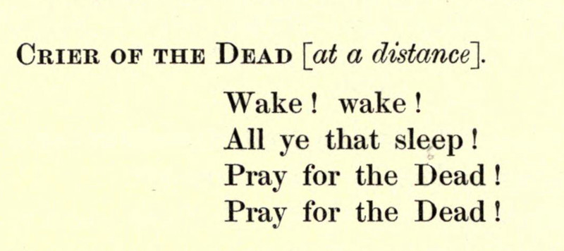 "Crier of the Dead: 'Wake! wake! All ye that sleep! Pray for the Dead! Pray for the Dead!" From The Golden Legend by Henry Wadsworth Longfellow and illustrated by Sidney H. Meteyard, 1914. See Strange Prayers for Strange Times.