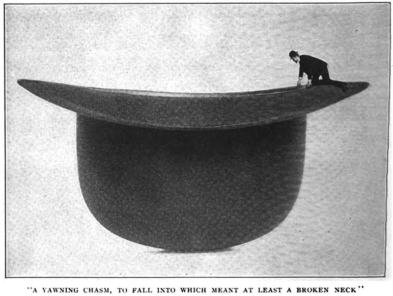 A surrealist illustration from a 1906 issue of Cosmopolitan magazine. The caption reads: "A yawning chasm, to fall into which meant at least a broken neck." Dedicated to Jordan Wright.