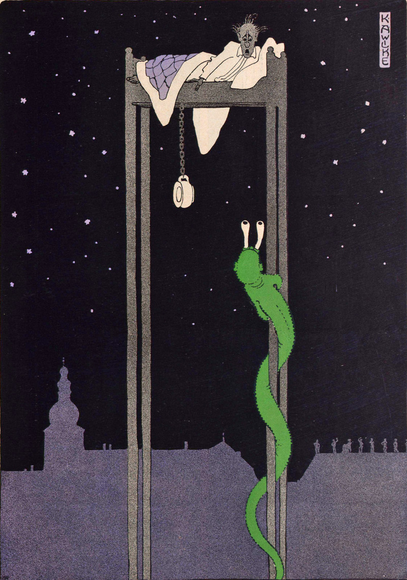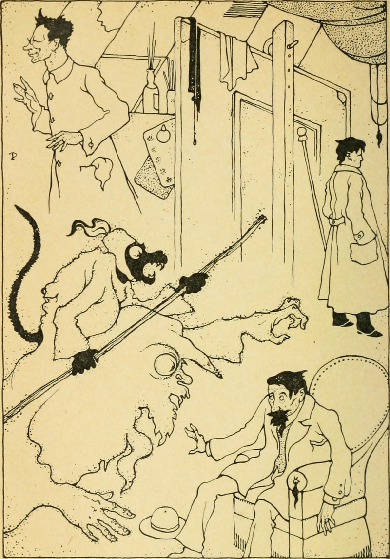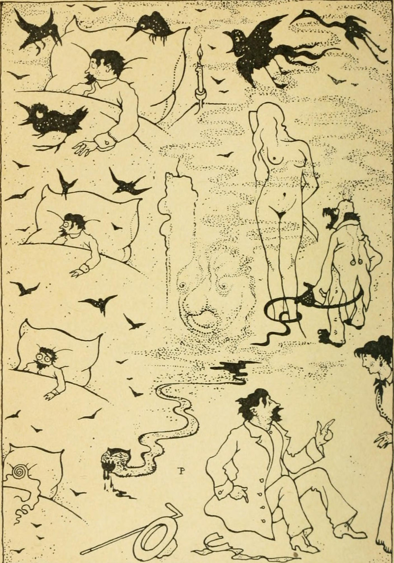 A duck-headed butler opening the door for a Poe-esque gentleman? Check. (By the way, that's a precursor to David Lynch's commercial for the Sony Playstation, in which a duck says, "Welcome to the 'third place.'") A faceless figure surrounded by disembodied cackling faces? Check. A crow in a jacket standing on a meditative sheep while an anthropomorphic dice cup spills and kills an innocent bystander? Check. A skeleton holding the Ace of Hearts? Check. Edward Gorey-esque despair on a settee? Check. Granted, the figure blowing his head off does seem rather too much. From Judy, Or The London Serio-Comic Journal, 1884.