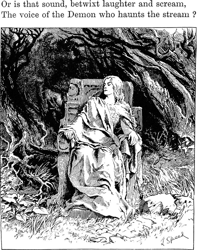An illustration from The Blue Poetry Book by Andrew Lang (1891). The caption reads: "Or is that sound, betwixt laughter and scream, The voice of the Demon who haunts the stream?"