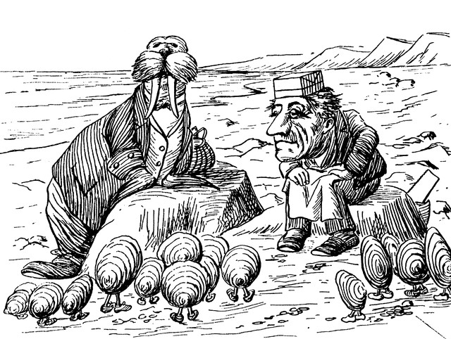 "The time has come," the Walrus said, "To talk of many things: Of shoes--and ships--and sealing-wax-- Of cabbages--and kings-- And why the sea is boiling hot-- And whether pigs have wings."