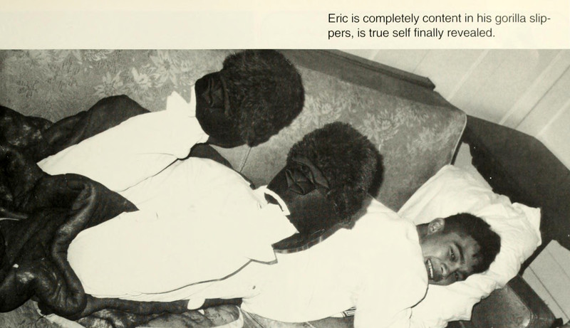 "Eric is completely content in his gorilla slippers, is [sic] true self finally revealed."  From Gannon University's 1995 yearbook.